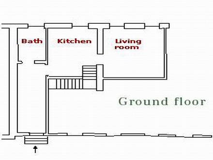 Begane grond: entree, keuken met eettafel, living met sofabed en eetgedeelte, badkamer met douche en bad.