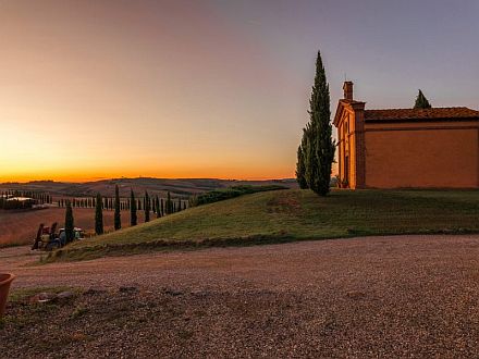 U bent, op deze heuveltop, met de voeten op aarde en met het hoofd bij onze "Schepper", welke naam u deze ook geeft... En dat is niet oneerbiedig bedoeld, in tegendeel! Je wordt er gewoon stil van .... Deze kleine groep gebouwen is gelegen op één van de mooiste plekken in de Crete Senesi, het gebied in de omgeving van Siena. Het landschap is werkelijk spectaculair te noemen; rondom het landgoed is het overal even mooi en kan er worden genoten van het uitzicht en spectaculaire zonsondergangen.